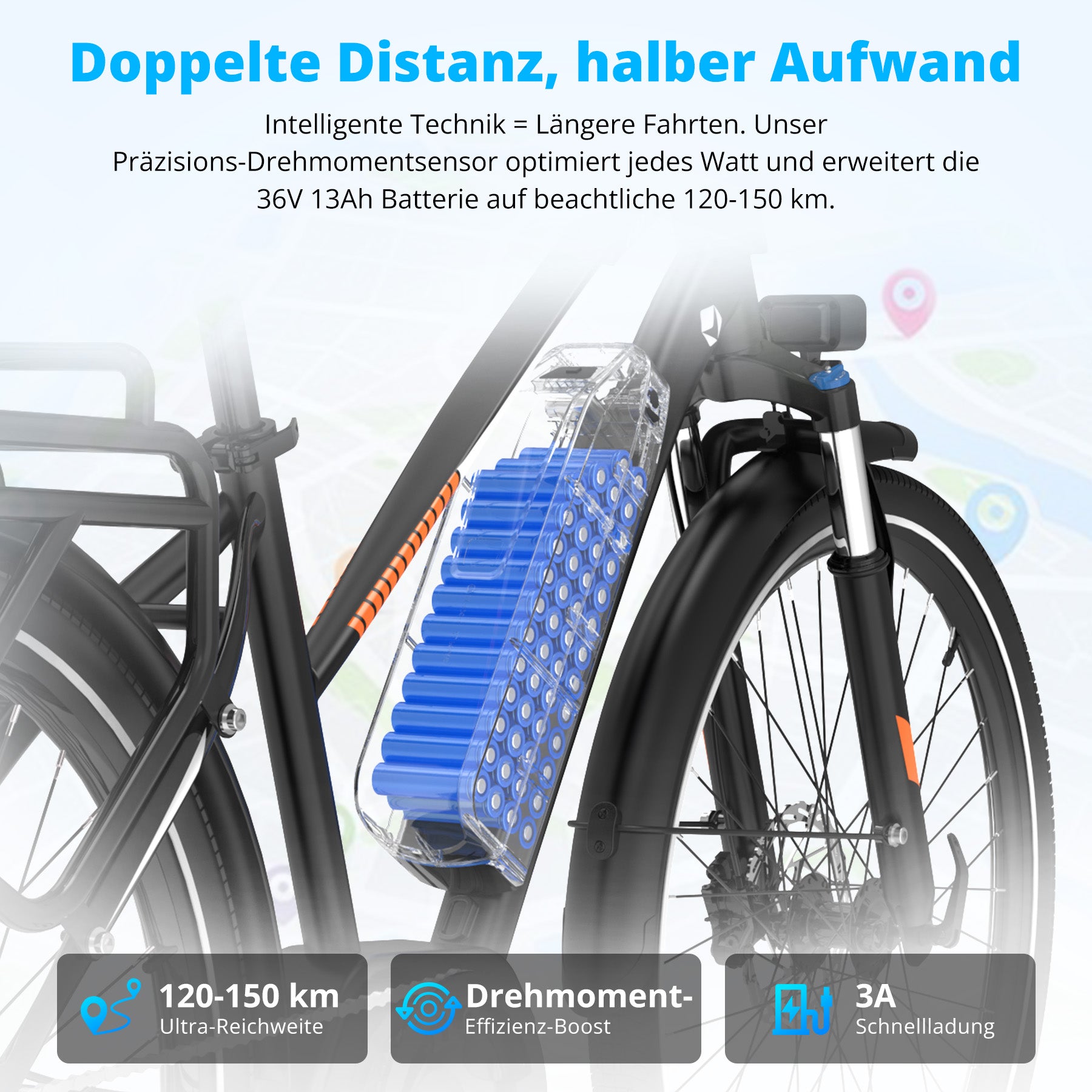 Entwickelt für anspruchsvolle Langstrecken-Pendler. Der 36V 13Ah Hochleistungs-Akku liefert eine beeindruckende Reichweite von 120 km bis zu 150 km mit nur einer Ladung. Dank der modernen 3A-Schnellladetechnologie ist der Akku in nur 4–5 Stunden wieder vollständig einsatzbereit. Das bedeutet für Sie: Weniger Zeit an der Steckdose und mehr Zeit für Entdeckungstouren durch die Stadt.