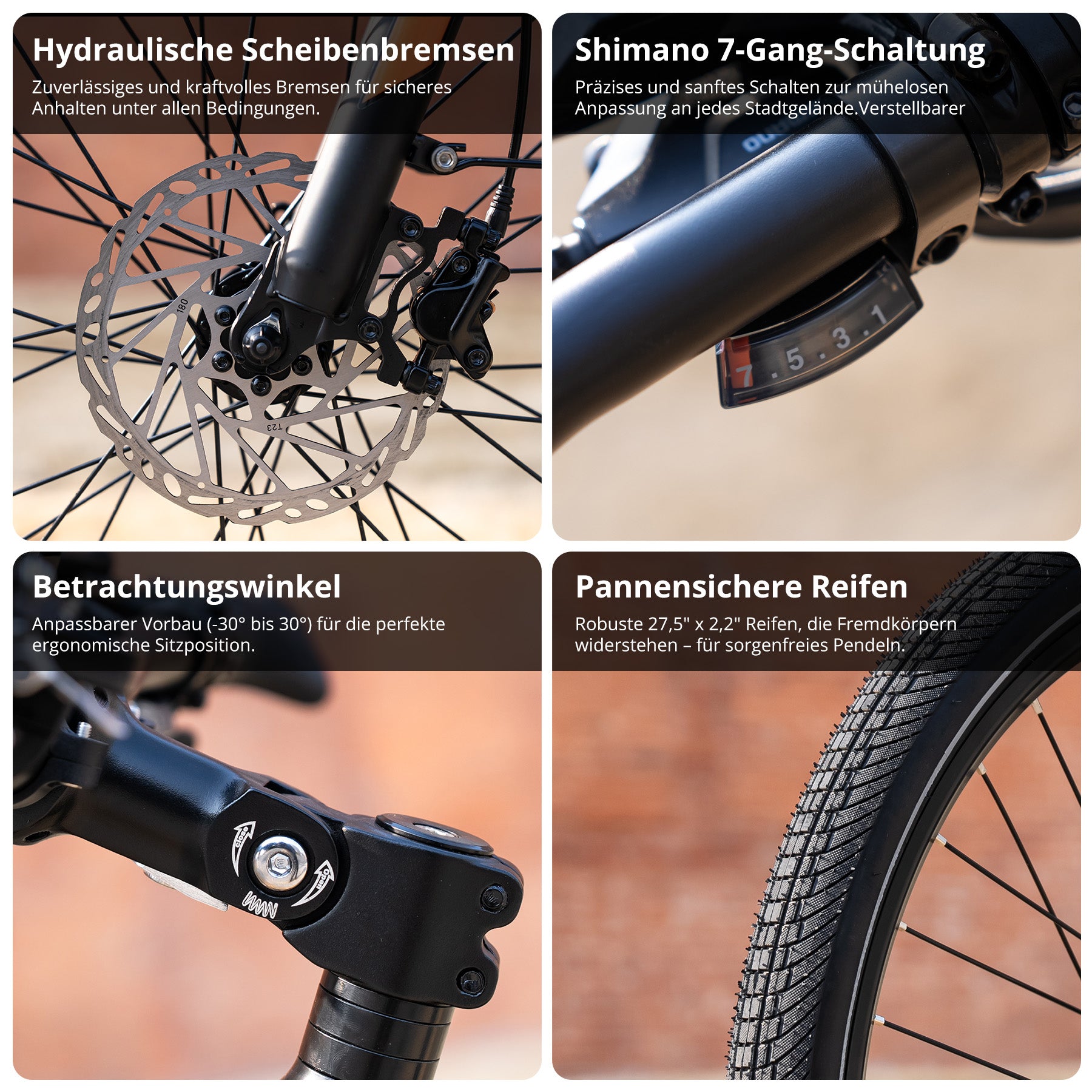 - Reifen: 27,5 × 2,2 Zoll pannensichere Luftreifen
