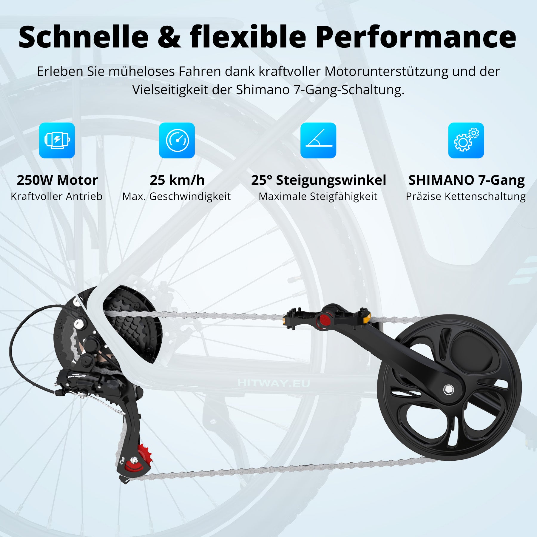 Erleben Sie ein geschmeidiges, maßgeschneidertes Fahrgefühl mit dem leistungsstarken bürstenlosen 250W-Motor in Kombination mit einer Shimano 7-Gang-Schaltung. Wählen Sie aus 3 Stufen der Pedalunterstützung (15/20/25 km/h), um Ihr ideales Tempo zu finden. So bezwingen Sie städtische Steigungen und Gegenwind, ohne ins Schwitzen zu geraten.