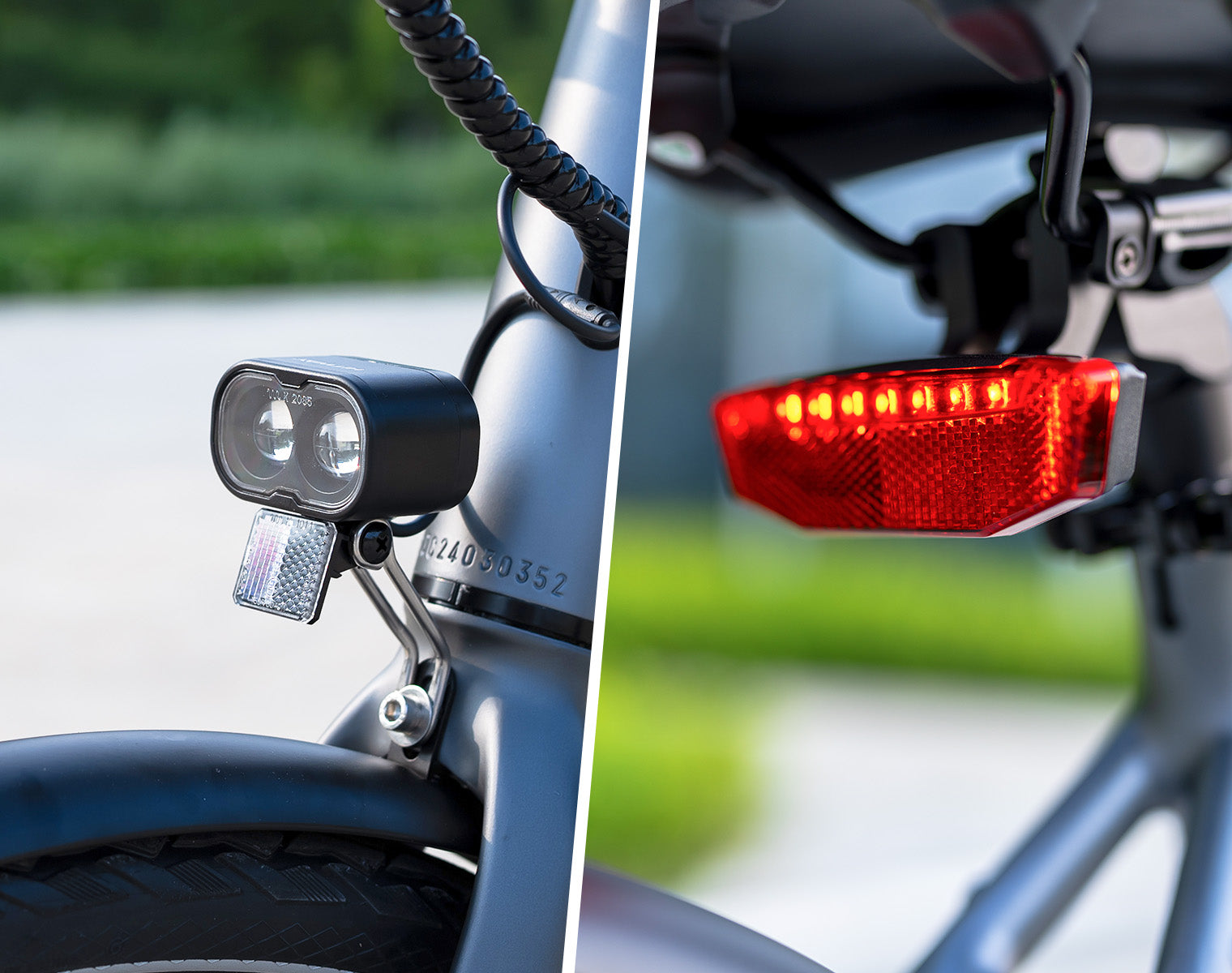 Fahren Sie Tag und Nacht sicher dank überlegener Beleuchtung. Das starke Vorderlicht gewährleistet klare Sicht nach vorne und erfüllt die strengen StVZO-Konformitätsstandards für den europäischen Markt. Das unverzichtbare hintere Sicherheitslicht sorgt für Rundumsicht, sodass Sie von hinten gut sichtbar sind. Beide Lichter bieten die notwendige gesetzliche Konformität und Sichtbarkeit für einen sicheren und vorschriftsmäßigen Pendelverkehr.