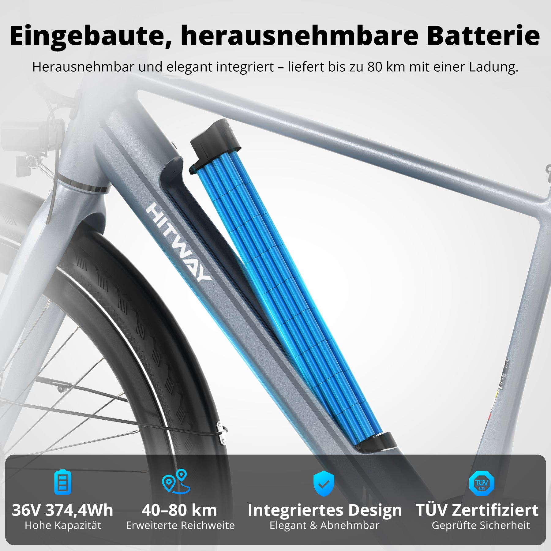 Der 36V 10,4AH (374,4WH) Akku ist perfekt in den Rahmen eingebettet und sorgt für eine harmonische und elegante Ästhetik. Diese clevere, integrierte Einheit ist leicht entnehmbar und ermöglicht so ein bequemes und sicheres Laden in Innenräumen. Sie liefert eine beeindruckende Reichweite von 40–80 km mit einer einzigen Ladung.