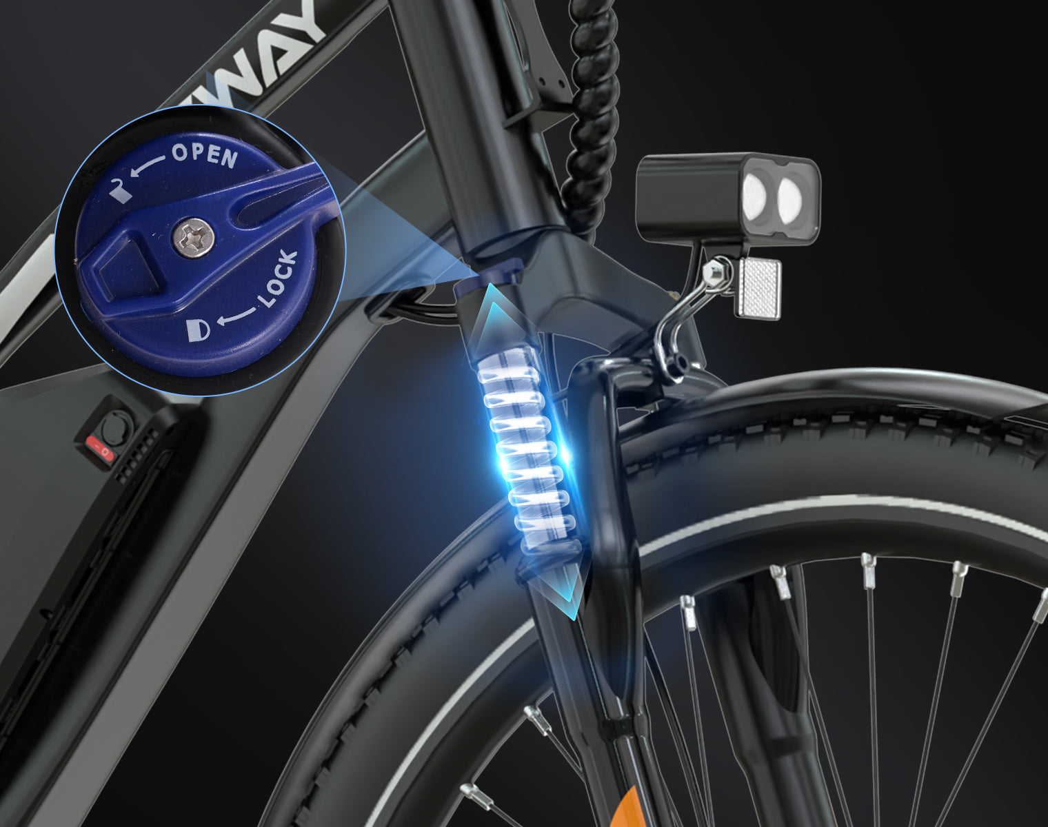 Meistern Sie mühelos unebene Stadtstraßen und holprige Wege. Die hochwertige blockierbare Federgabel dämpft Stöße und Vibrationen effektiv ab und erhöht so den Fahrkomfort spürbar. Blockieren Sie die Federung auf glatten Strecken für mehr Effizienz beim Treten und entriegeln Sie sie bei rauem Untergrund für maximale Stoßdämpfung.