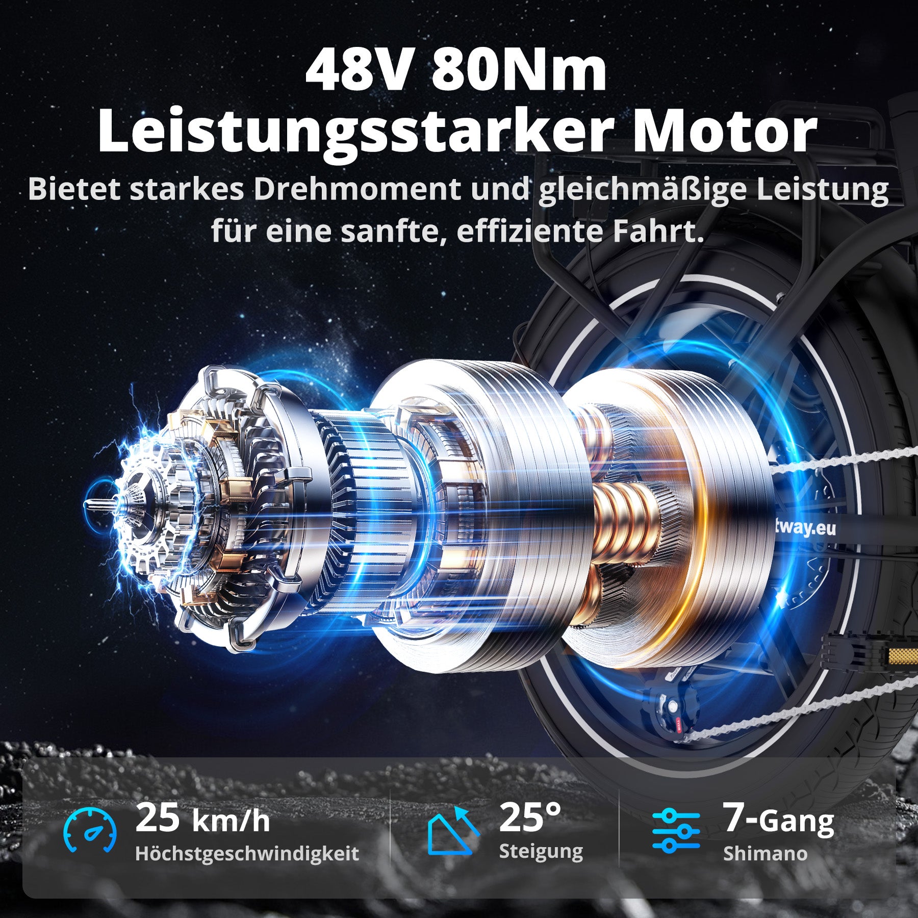 Ausgestattet mit einem drehmomentstarken 48V-Motor, der beeindruckende 80 Nm liefert, gewährleistet dieses E-Bike eine geschmeidige Beschleunigung, stabile Kraftentfaltung und müheloses Bewältigen von Steigungen von bis zu 25°. In Kombination mit der in Deutschland/der EU üblichen Höchstgeschwindigkeit von 25 km/h und dem zuverlässigen Shimano 7-Gang-Antrieb bietet es ein effizientes und angenehmes Fahrerlebnis auf Stadtstraßen und unterschiedlichstem Terrain.