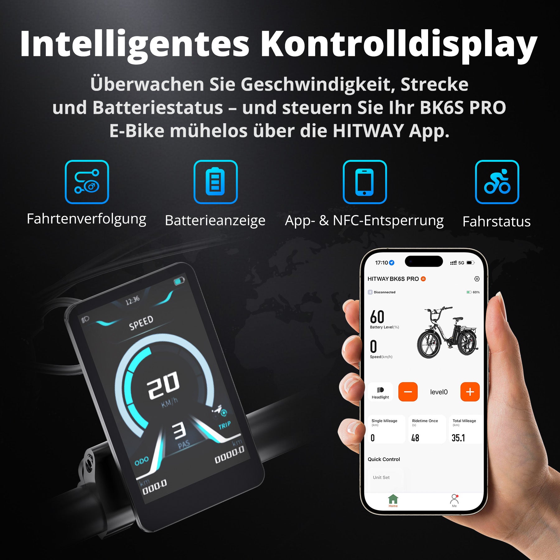 Das BK6S PRO verfügt über eine intelligente App-Integration inklusive NFC-Entsperrung für ein Höchstmaß an Sicherheit und Komfort. Überprüfen Sie Ihren Kilometerstand, den Akkustatus und Ihre Fahrtenhistorie direkt in der App, oder steuern Sie Beleuchtung und Unterstützungsstufen (PAS) aus der Ferne. Zusätzliche Passwort- und NFC-Sicherheitseinstellungen erhöhen den Diebstahlschutz im täglichen Pendelverkehr.