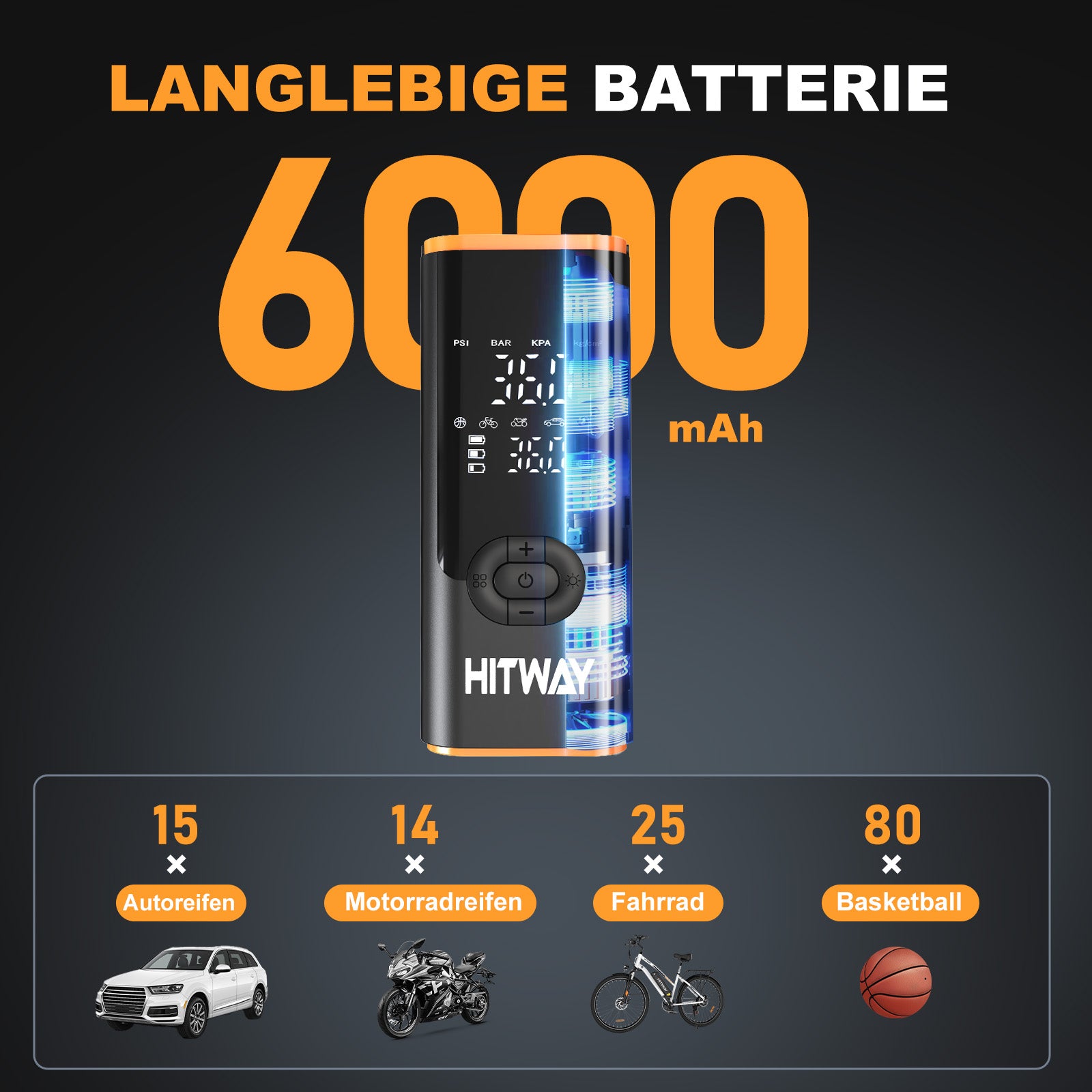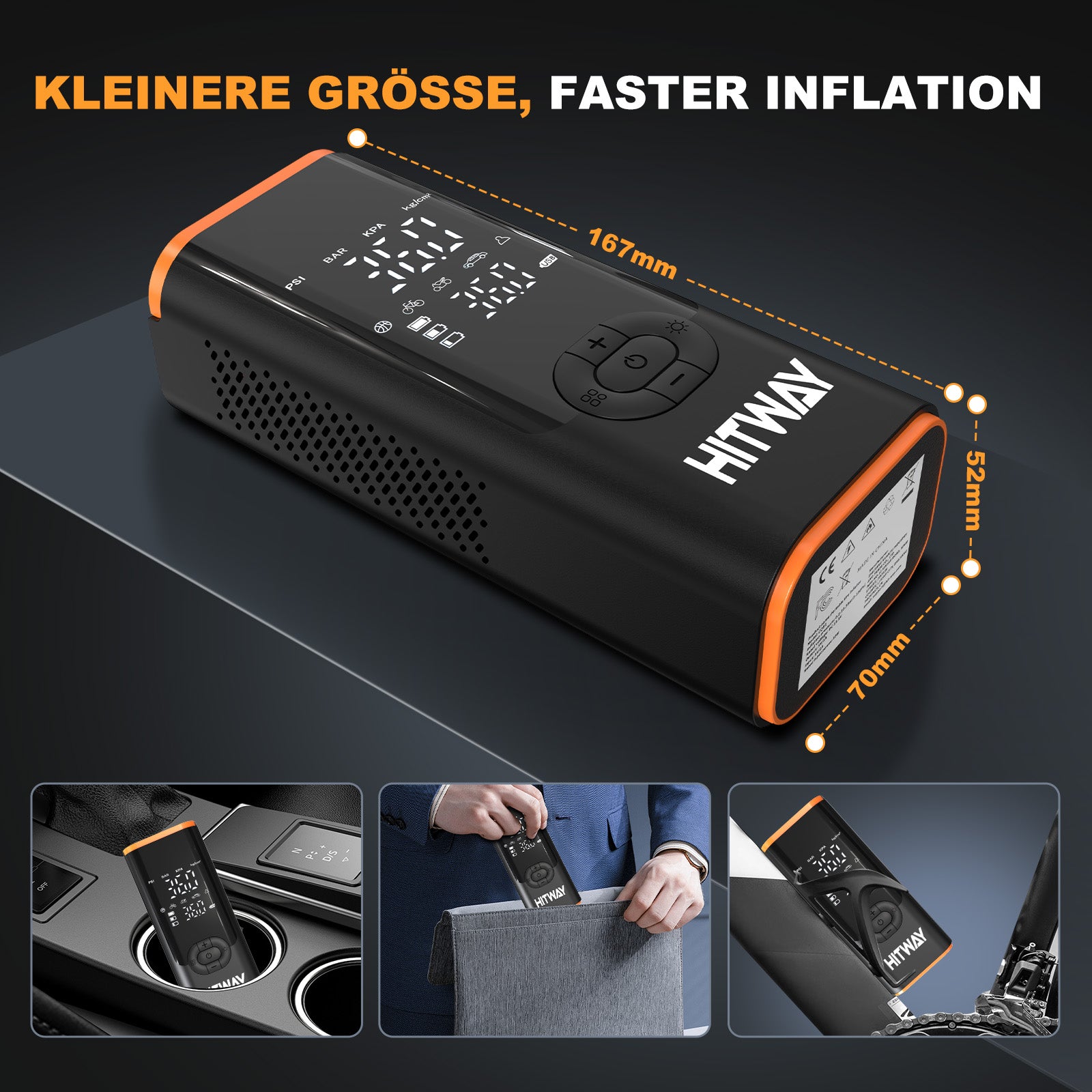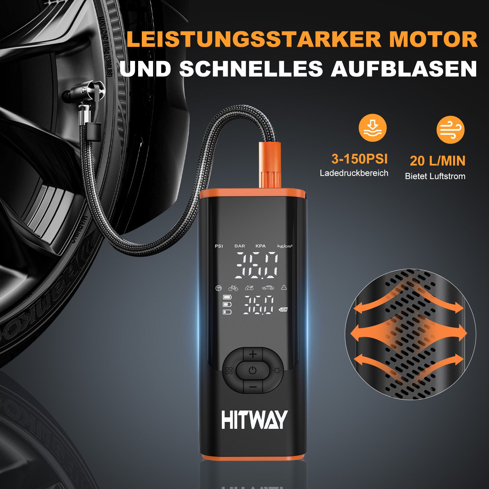 The portable HITWAY air pump delivers up to 150 PSI of pressure with an air flow of 20 l/min. Car tires are inflated in just 6 minutes, and bicycles and balls in just 20 seconds—ideal for everyday use.