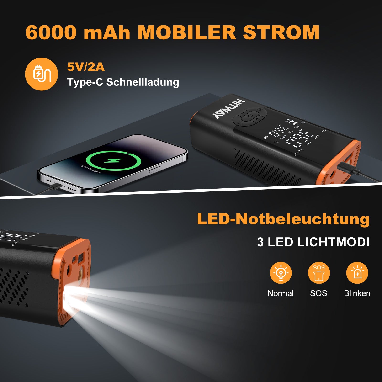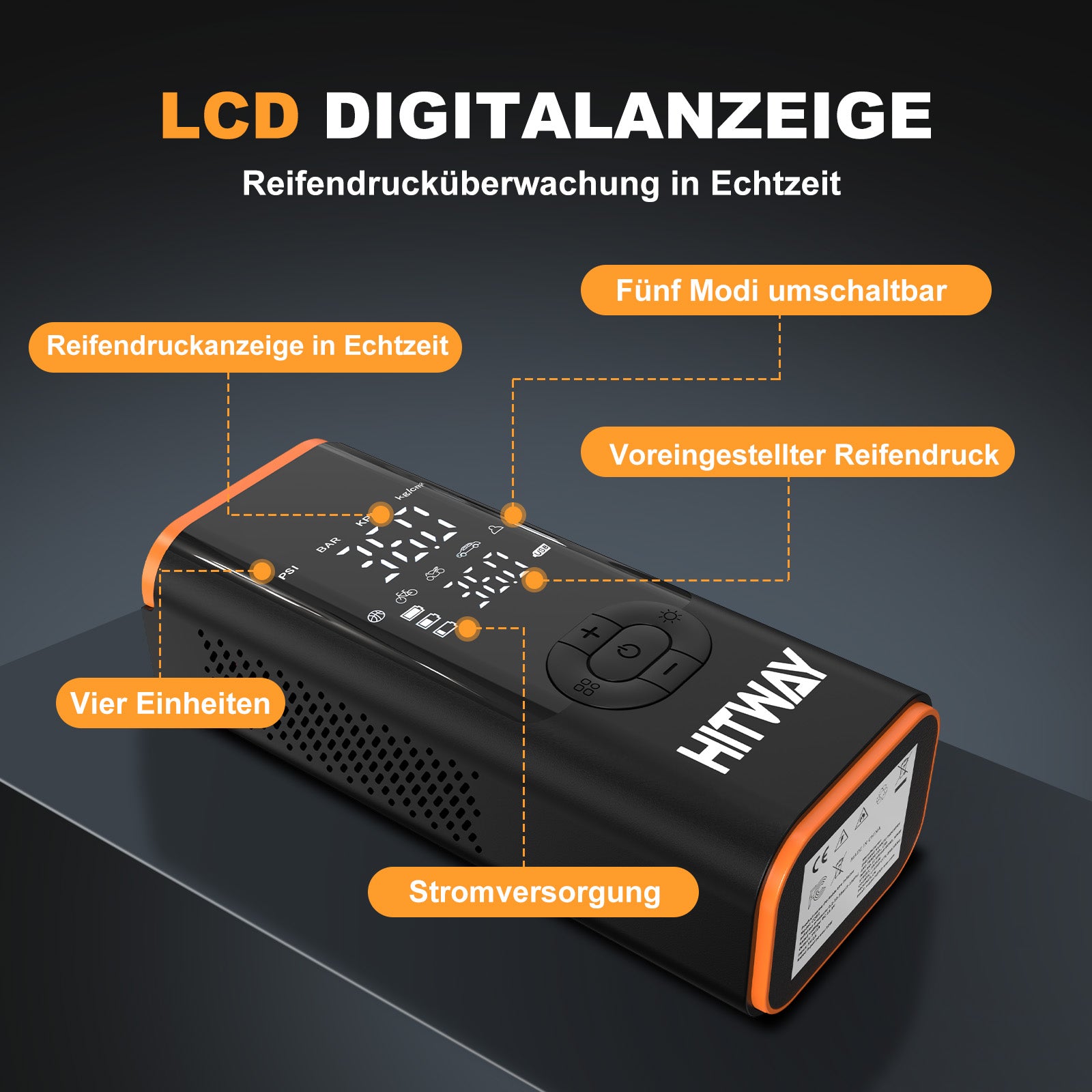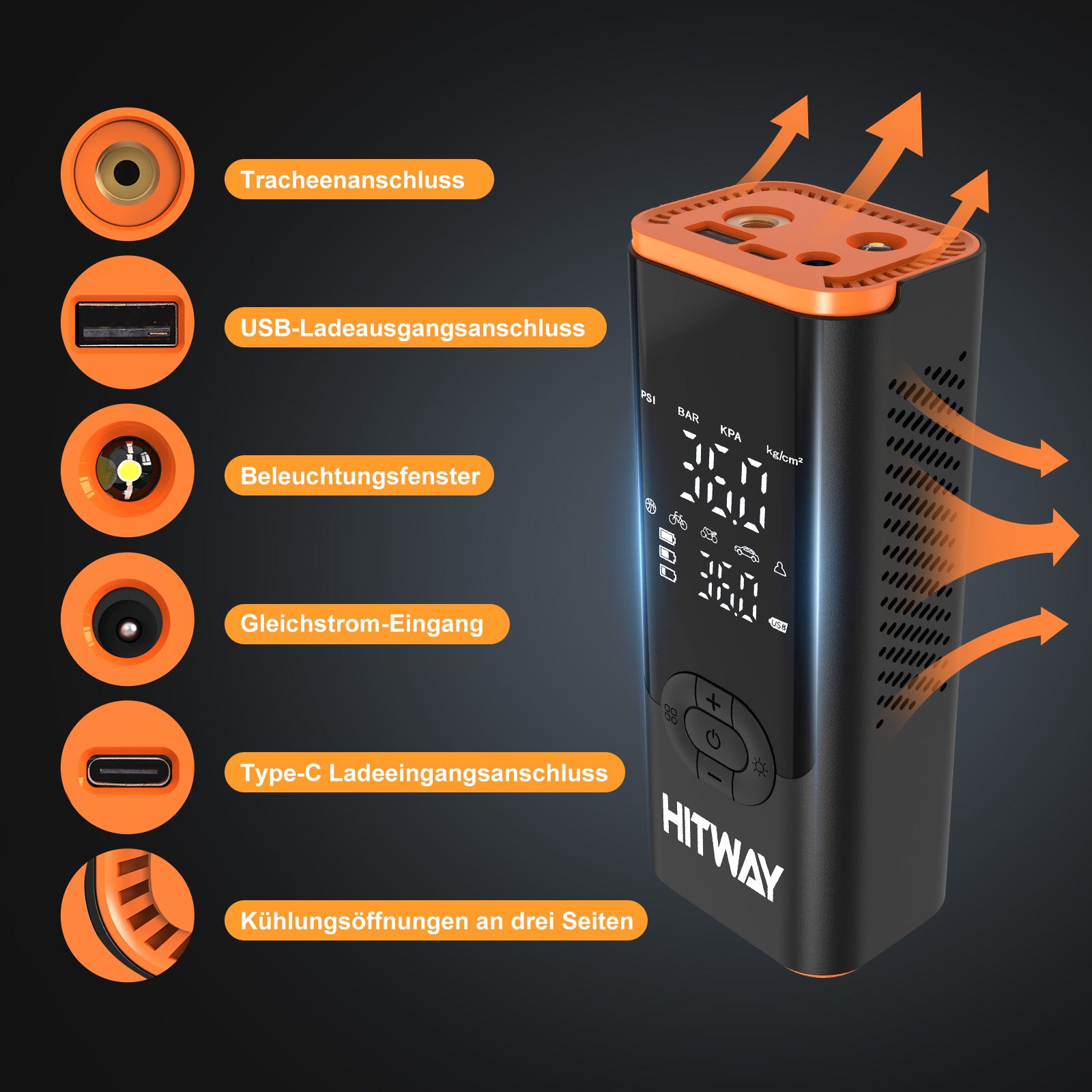 The portable HITWAY air pump delivers up to 150 PSI of pressure with an air flow of 20 l/min. Car tires are inflated in just 6 minutes, and bicycles and balls in just 20 seconds—ideal for everyday use.
