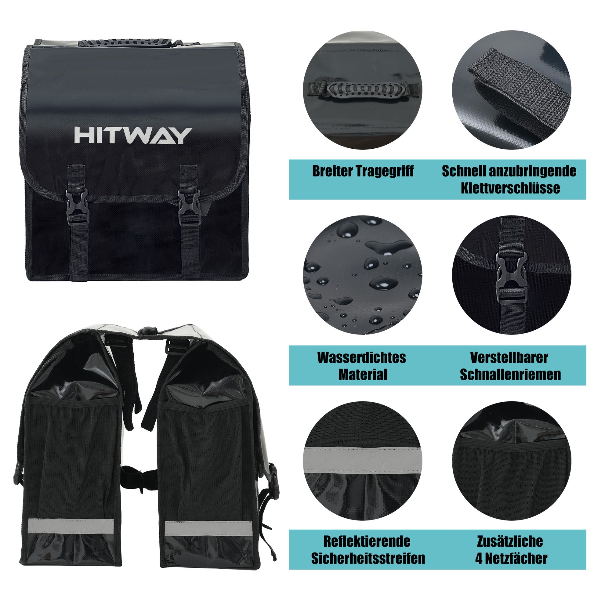 With 4 mesh pockets for water bottles. Reflectors at the front and back ensure safety. 4 straps and 2 Velcro fasteners on the bottom fix the bag securely to the frame.