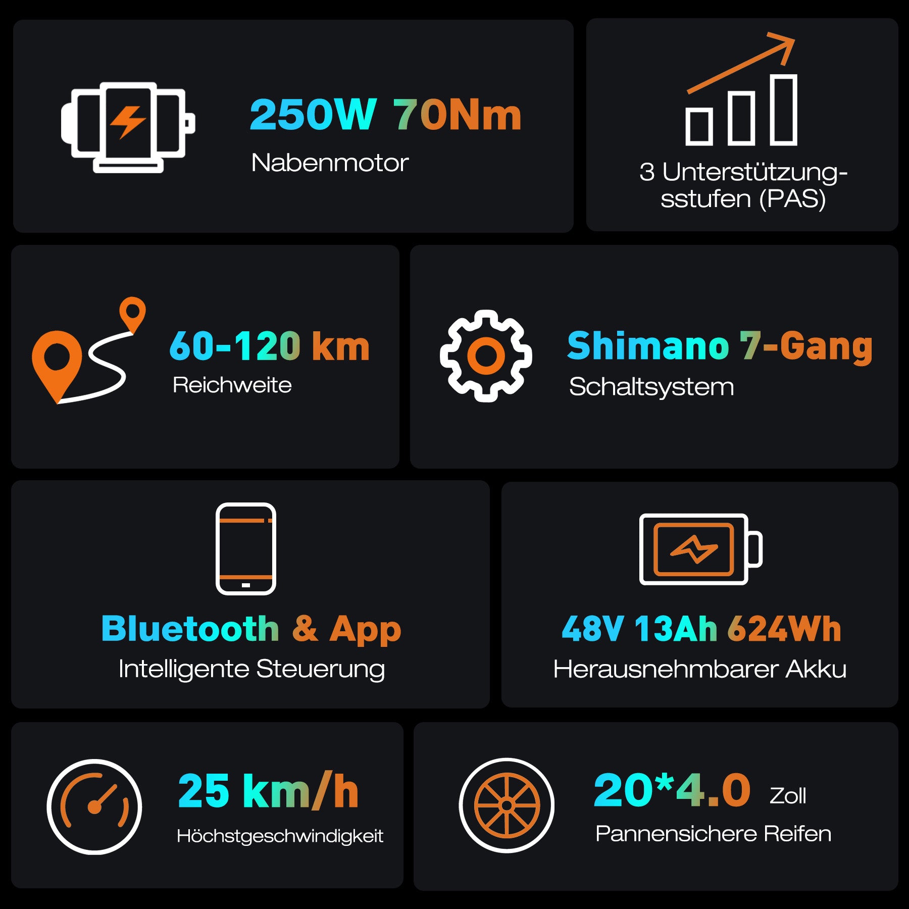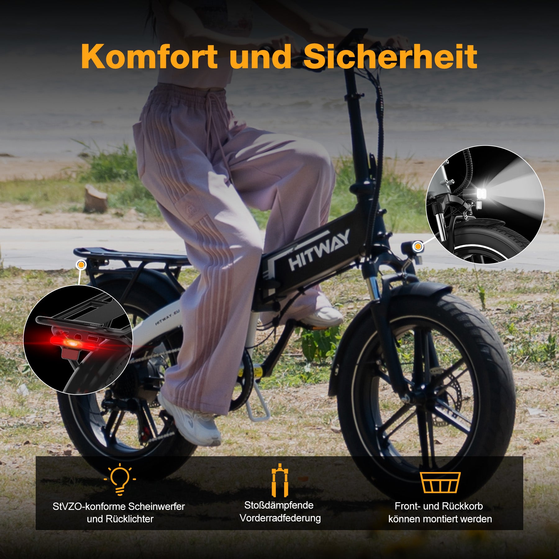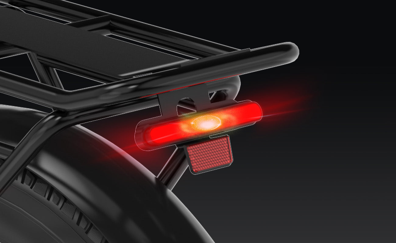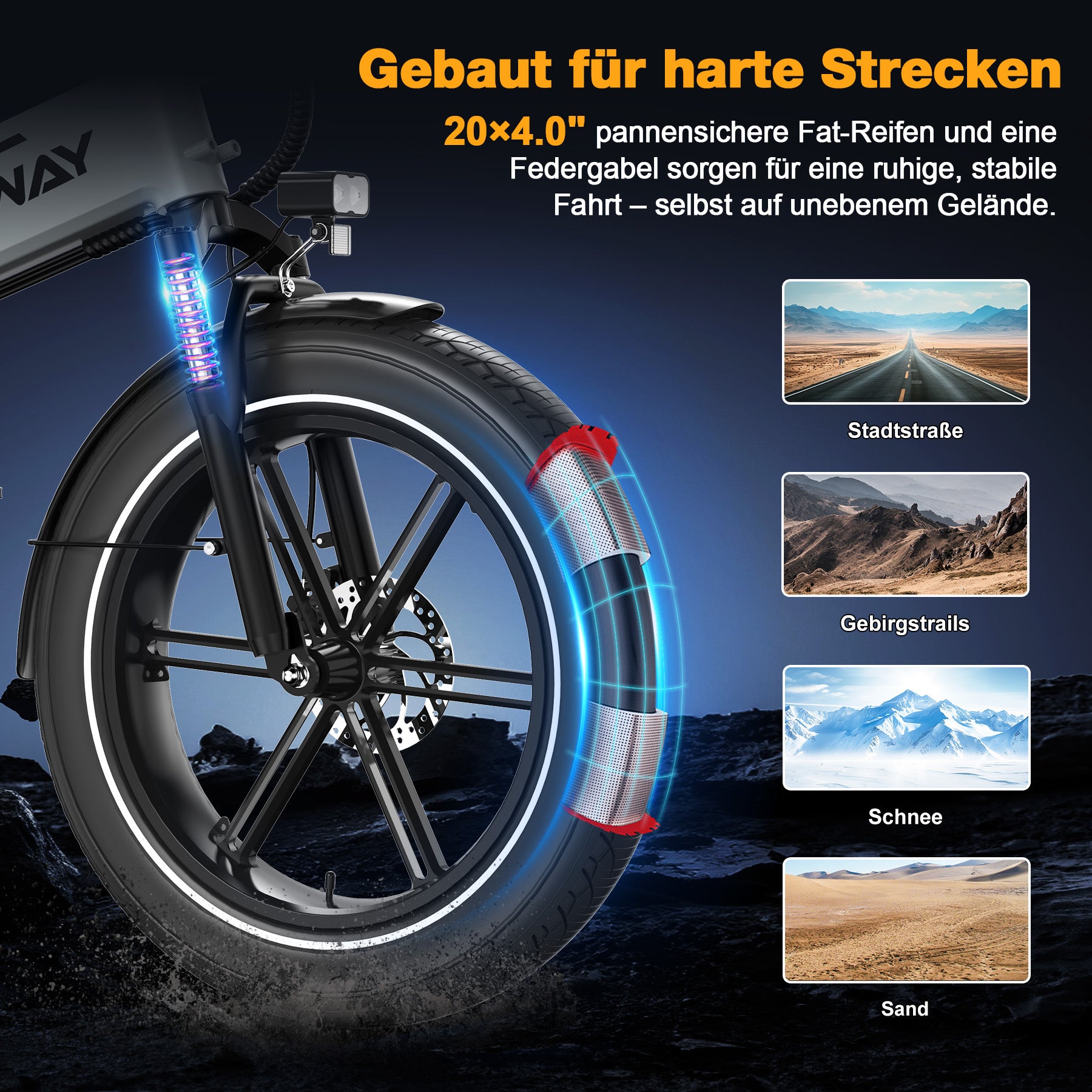 Das E-Bike verfügt über robuste 20x4,0-Zoll-Reifen, die jetzt mit einer Technologie zur erhöhten Widerstandsfähigkeit ausgestattet sind. Fahren Sie beruhigt, denn diese Reifen sind dafür ausgelegt, eine reibungslose und zuverlässige Leistung auf jedem Gelände zu bieten.
