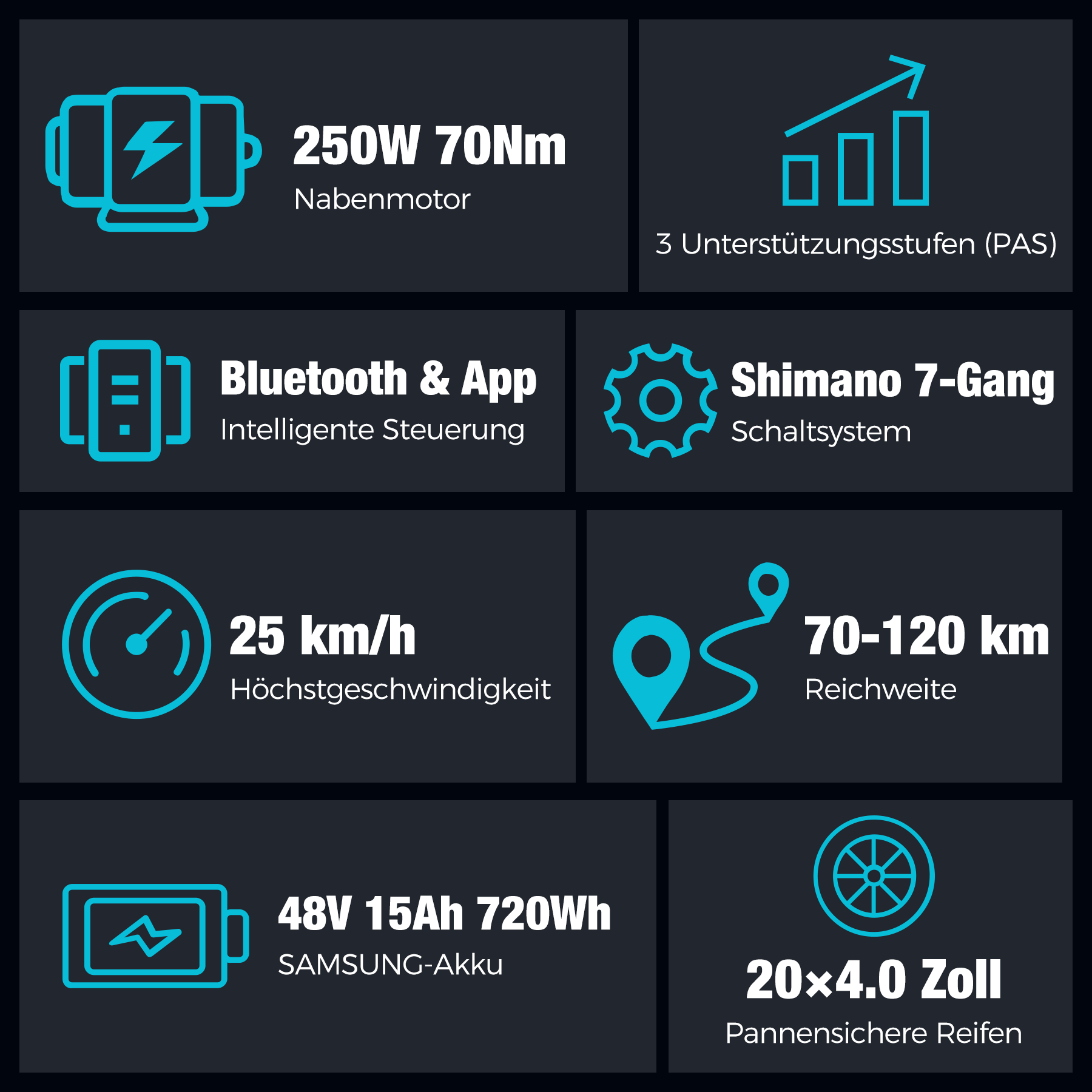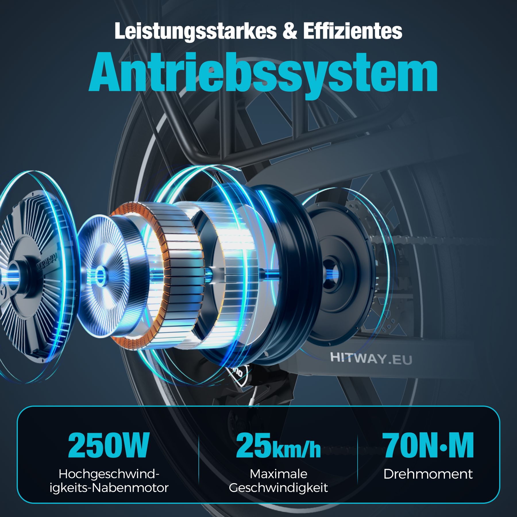 Kraftvoller 250W-Motor mit 70 Nm Drehmoment – ideal für Steigungen.