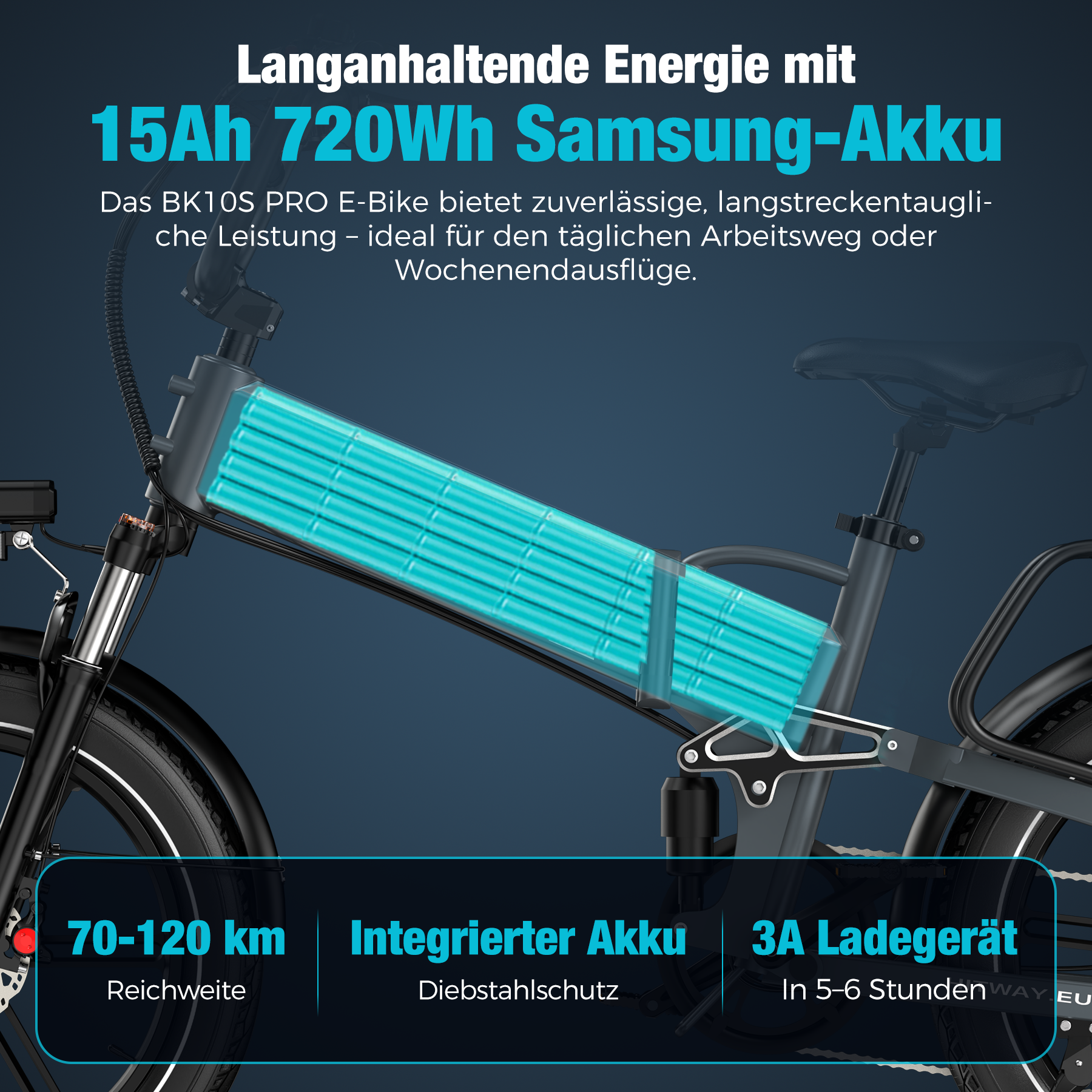 Der HITWAY BK10S PRO verfügt über einen 48V 15Ah Lithium-Akku mit hochwertigen Samsung-Zellen und einer Gesamtkapazität von 720Wh. Damit erreichst du eine beeindruckende Reichweite von 70–120 km mit nur einer Ladung – ideal für tägliche Pendelfahrten oder ausgedehnte Touren ins Gelände. Der herausnehmbare Akku bietet zusätzlich Komfort und Sicherheit beim Laden.