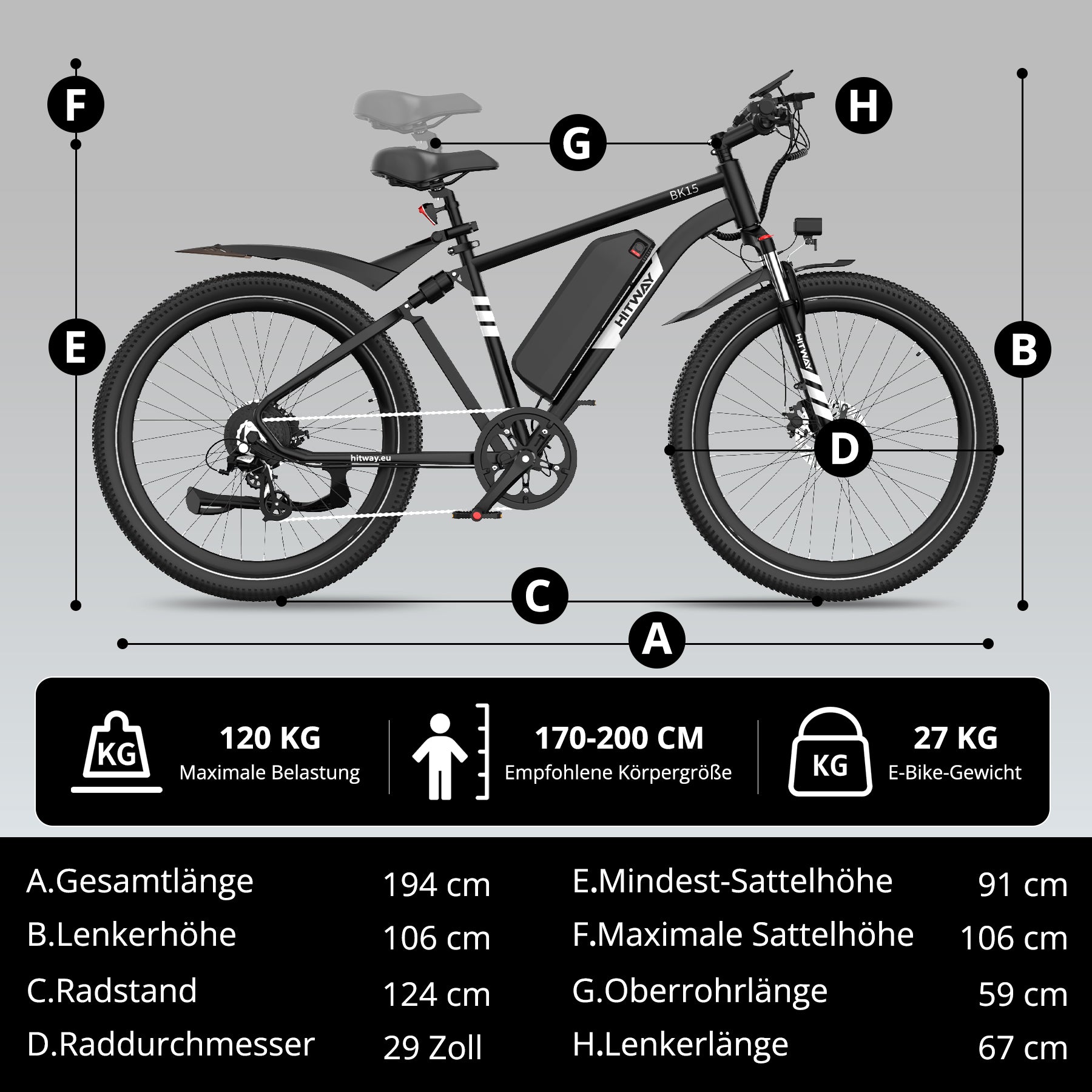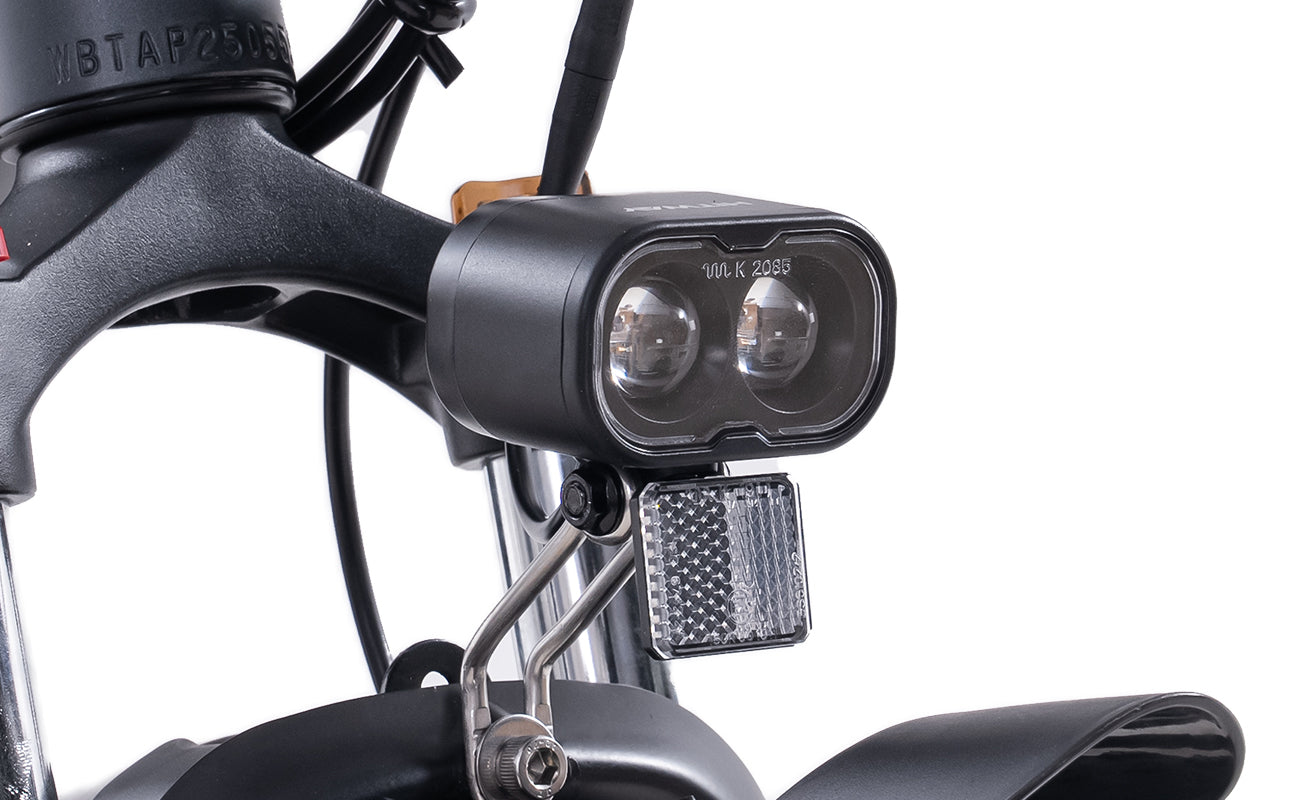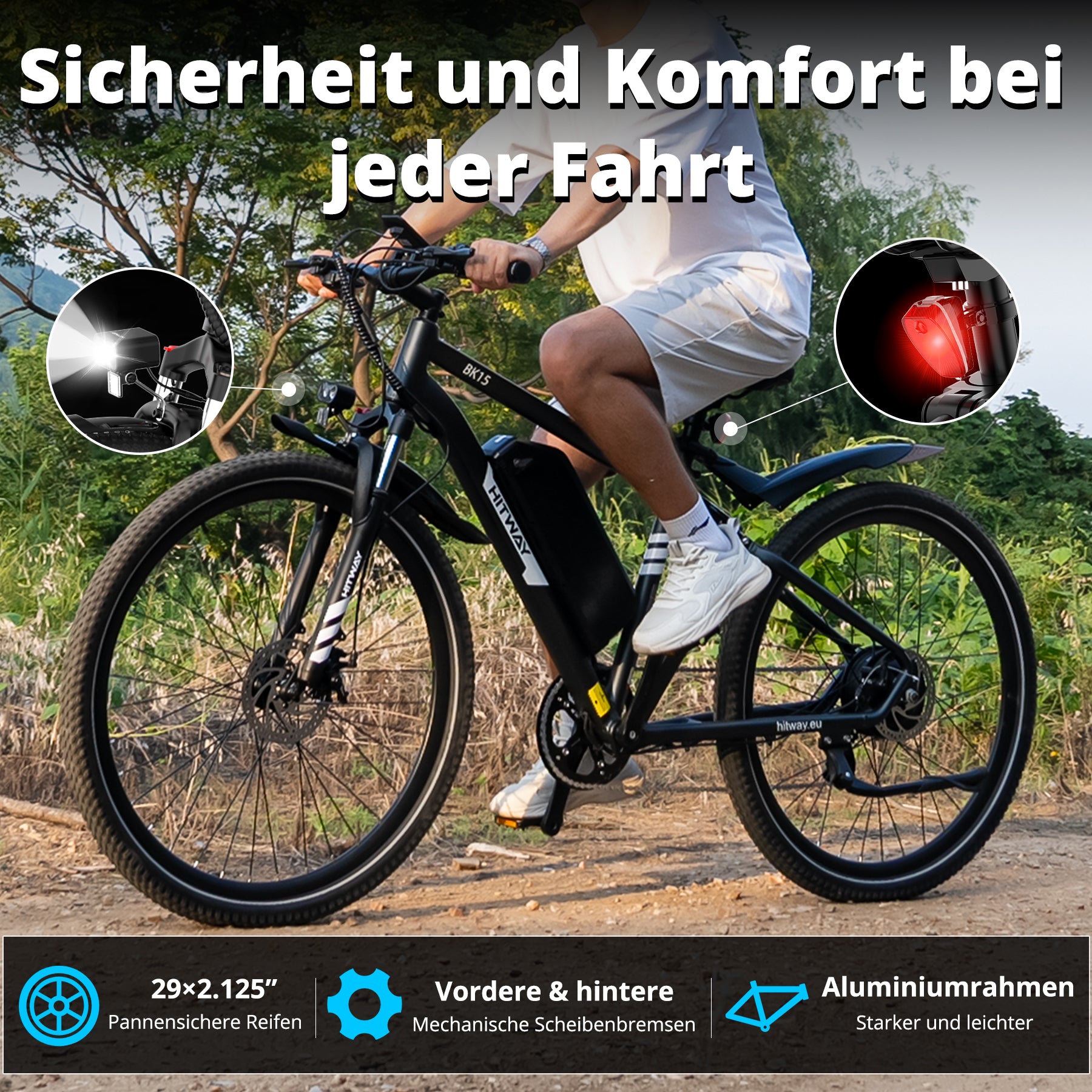 Die pannensicheren 29 x 2,125 Zoll Reifen, der leichte Aluminiumrahmen (27 kg) und das Shimano 7-Gang-Schaltsystem machen dieses E-Bike vielseitig und zuverlässig – von urbanen Straßen bis hin zu Schotterwegen. Mit vorderen und hinteren LED-Lichtern, verstellbaren Schutzblechen und einer ergonomischen Sitzposition sorgt das BK15 PLUS für Sicherheit, Komfort und Fahrspaß bei jeder Tour.