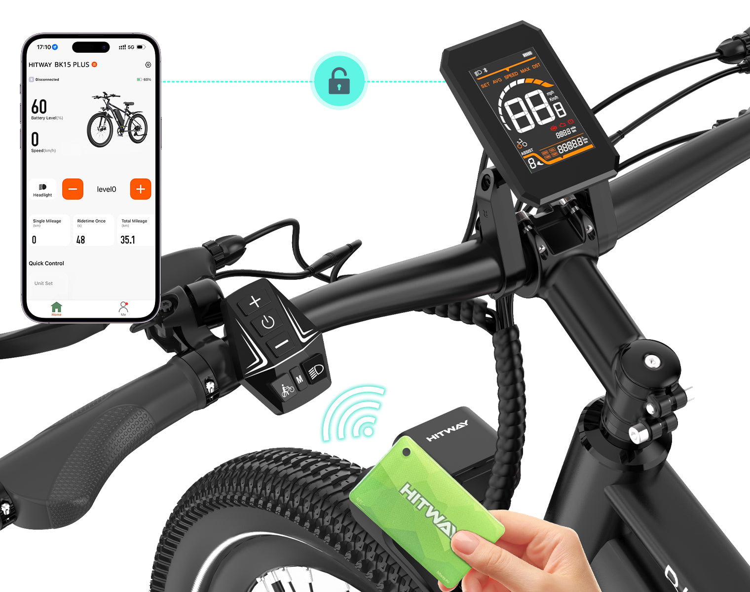 Entriegeln Sie Ihr E-Bike im Handumdrehen – entweder per NFC-Chip oder über die HITWAY App via Bluetooth. Das übersichtliche LCD-Display zeigt Ihnen Geschwindigkeit, Kilometerstand und Akkustatus in Echtzeit an, damit Sie Ihre Fahrt stets im Blick haben. Die NFC-Funktion bietet zudem einen zusätzlichen Diebstahlschutz, damit Ihr E-Bike sicher bleibt – ob zu Hause oder unterwegs.