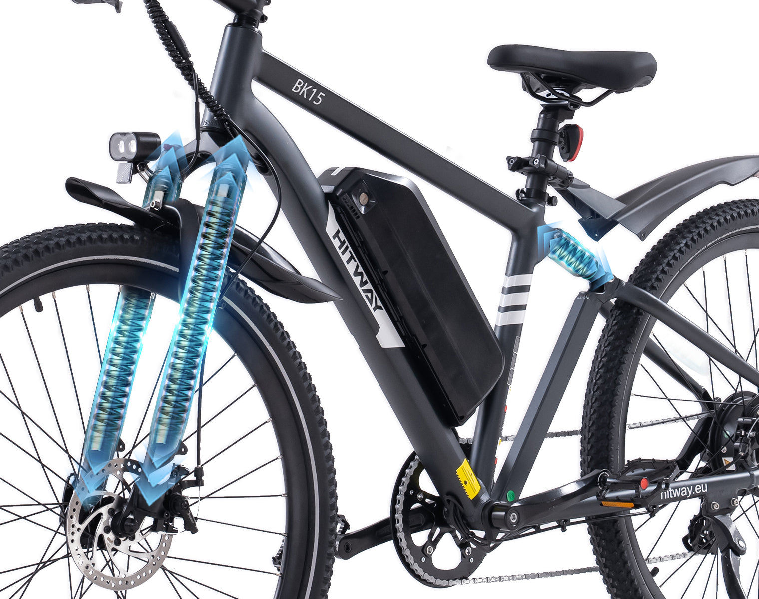 Das BK15 PLUS E-Mountainbike ist mit einer verriegelbaren Federgabel und einem zentralen Stoßdämpfer ausgestattet, die Unebenheiten und Vibrationen effektiv abfangen. So genießen Sie geschmeidige, stabile und komfortable Fahrten – egal ob auf Asphalt, Schotter oder unebenem Gelände.