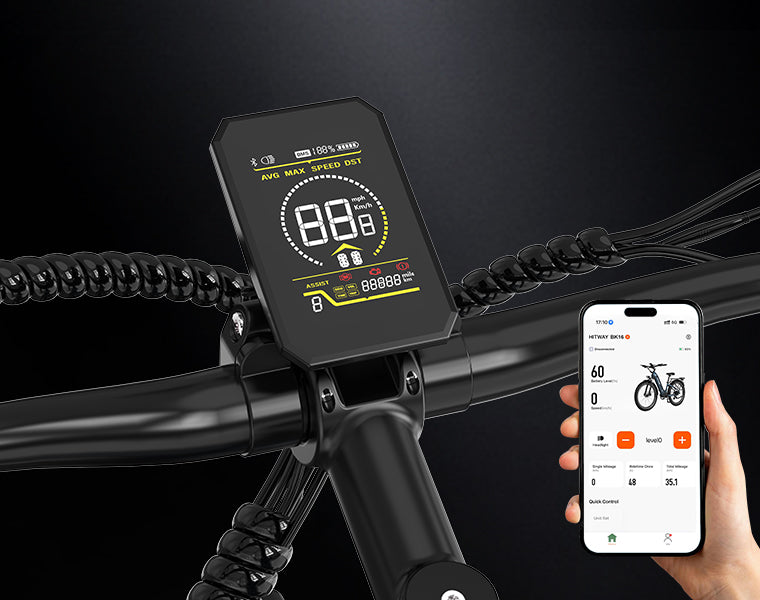 Das zentral platzierte Display zeigt Geschwindigkeit, Akkustand und verbleibende Reichweite auf einen Blick an. In der APP-Version ermöglicht Bluetooth die Verbindung mit Ihrem Smartphone, um Antrieb, Beleuchtung und Unterstützungsstufen bequem zu steuern. Über Tasten am Lenker können Sie Assistenzstufen wechseln oder das Licht ein- und ausschalten.