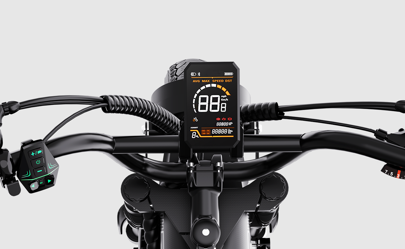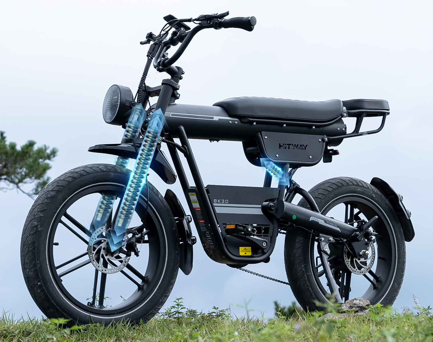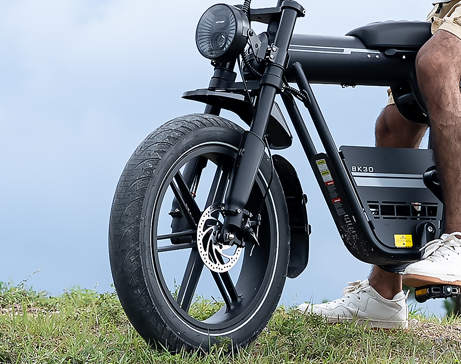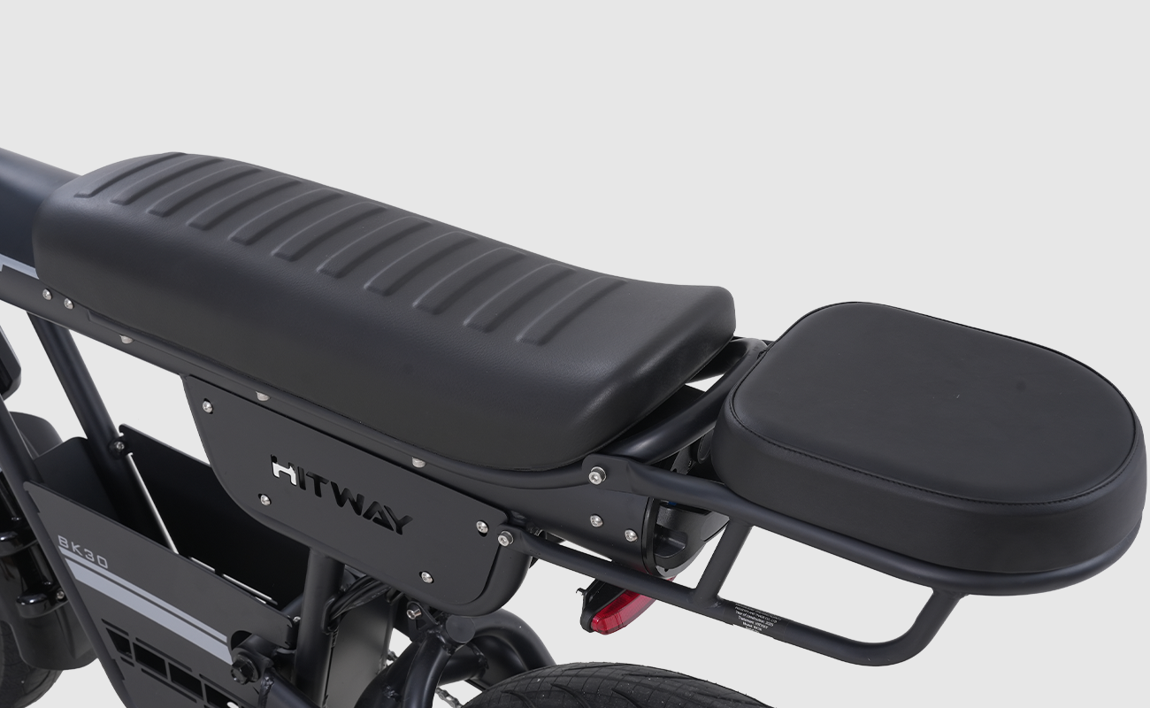Das Design des BK30 Fat Tire E-Bikes verbindet den klassischen Look eines Retro-Motorrads mit moderner Ingenieurskunst. Die Kombination aus Federgabel vorne und hinterem Luftdämpfer absorbiert effektiv Stöße auf unebenen Straßen und sorgt für ein geschmeidiges, komfortables Fahrgefühl. Der hochfeste Stahlrahmen trägt Fahrer bis zu 120 kg und bietet sowohl Stabilität als auch Langlebigkeit – perfekt für alle, die Stil und Stärke schätzen.