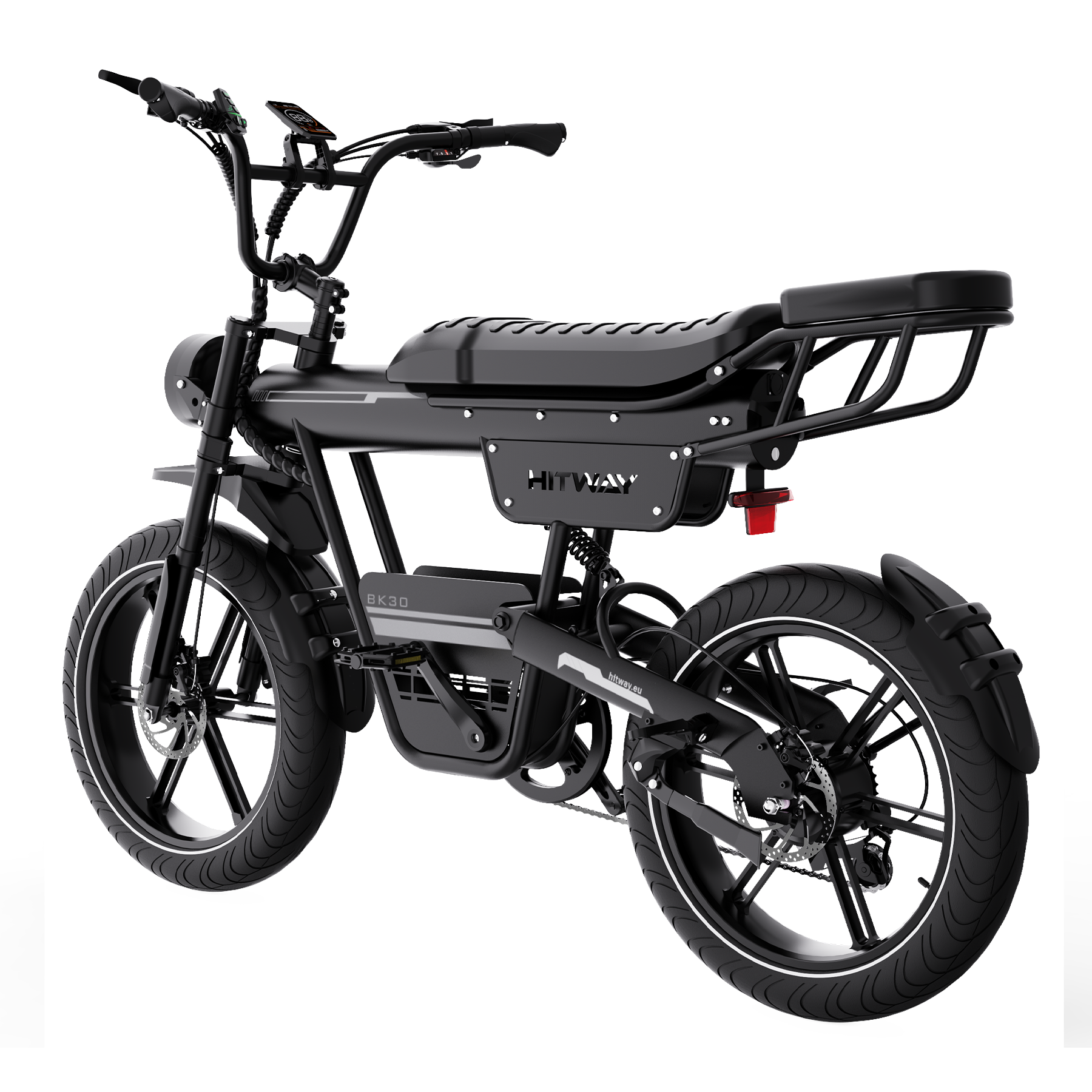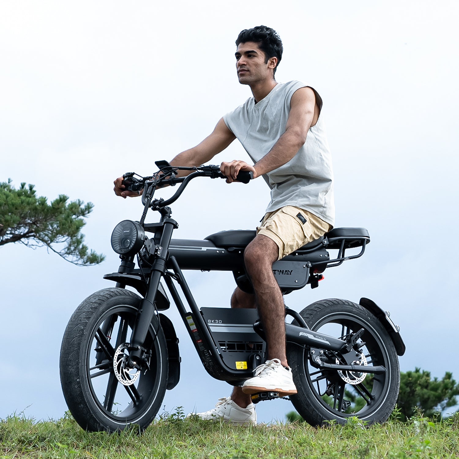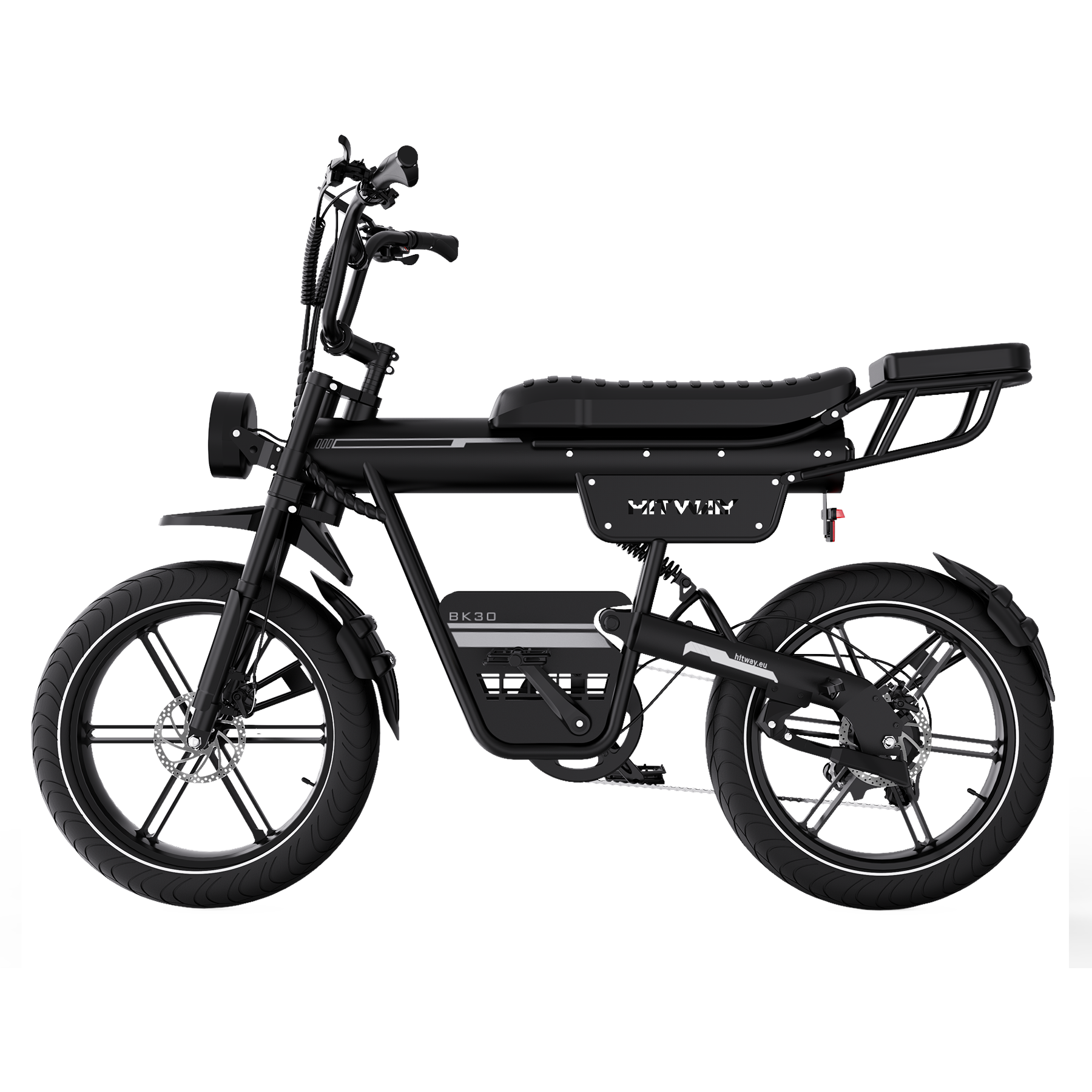 Das Design des BK30 Fat Tire E-Bikes verbindet den klassischen Look eines Retro-Motorrads mit moderner Ingenieurskunst. Die Kombination aus Federgabel vorne und hinterem Luftdämpfer absorbiert effektiv Stöße auf unebenen Straßen und sorgt für ein geschmeidiges, komfortables Fahrgefühl. Der hochfeste Stahlrahmen trägt Fahrer bis zu 120 kg und bietet sowohl Stabilität als auch Langlebigkeit – perfekt für alle, die Stil und Stärke schätzen.