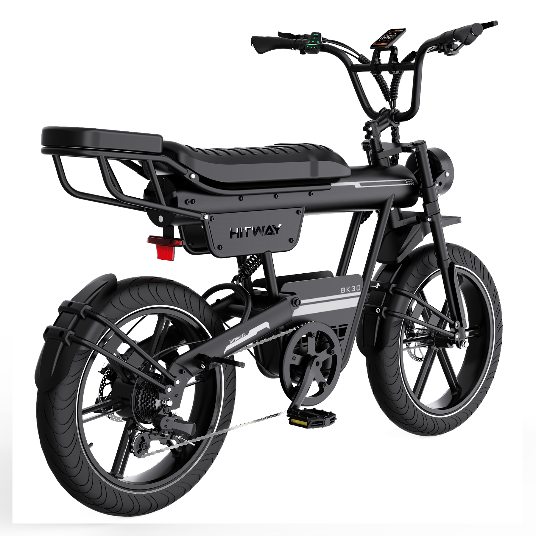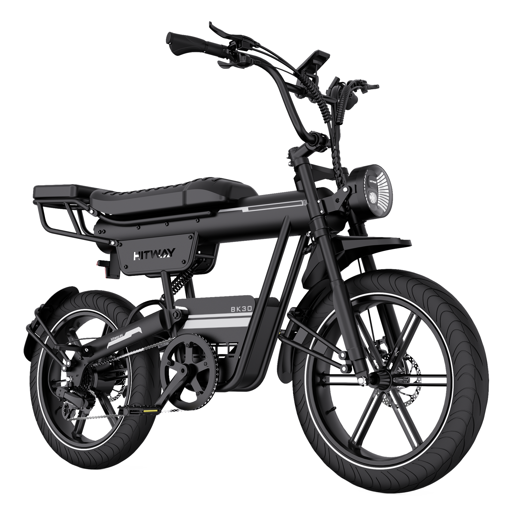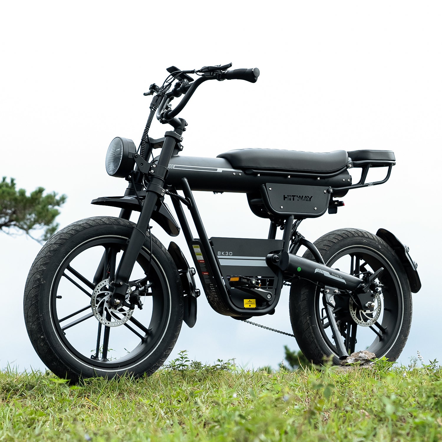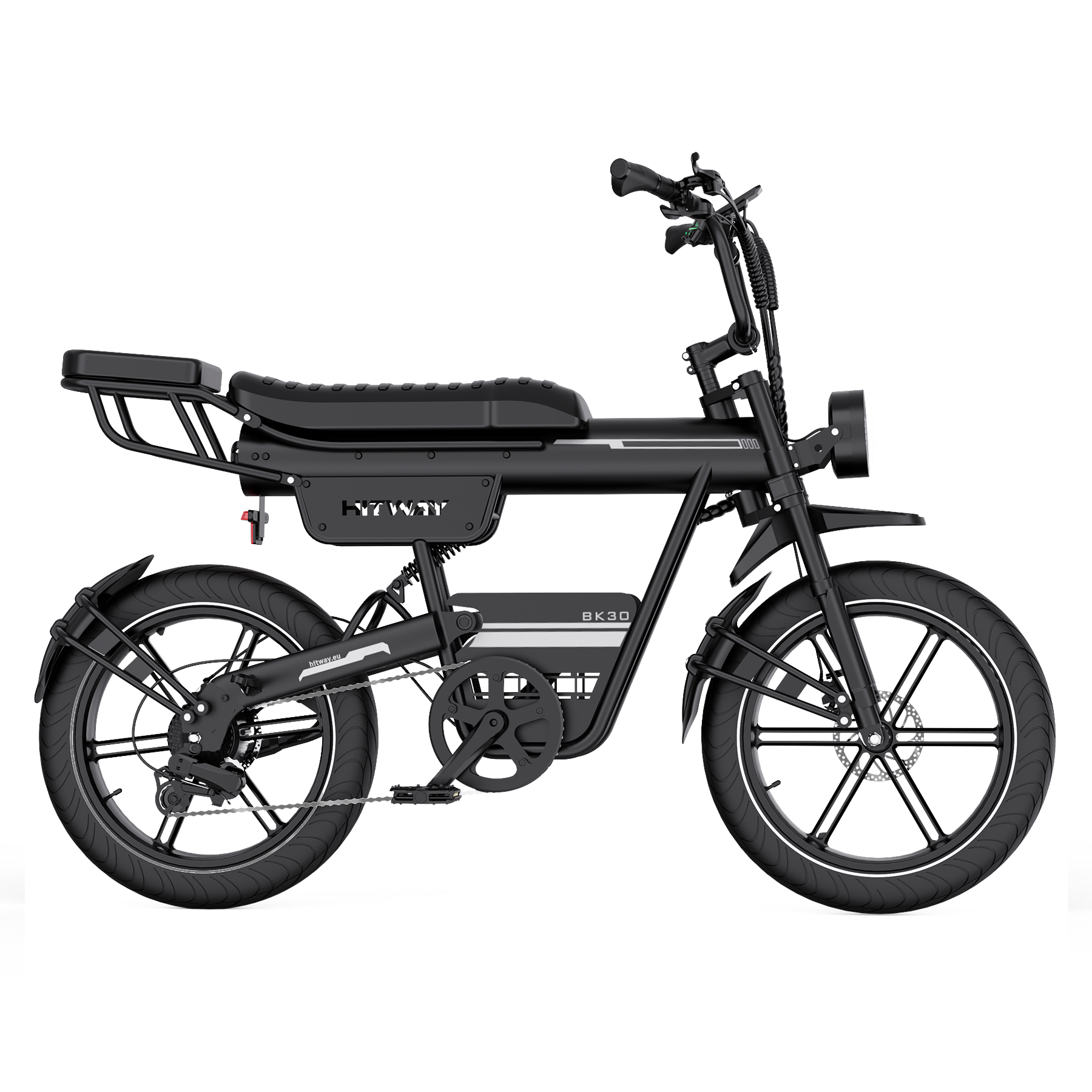 Das Design des BK30 Fat Tire E-Bikes verbindet den klassischen Look eines Retro-Motorrads mit moderner Ingenieurskunst. Die Kombination aus Federgabel vorne und hinterem Luftdämpfer absorbiert effektiv Stöße auf unebenen Straßen und sorgt für ein geschmeidiges, komfortables Fahrgefühl. Der hochfeste Stahlrahmen trägt Fahrer bis zu 120 kg und bietet sowohl Stabilität als auch Langlebigkeit – perfekt für alle, die Stil und Stärke schätzen.