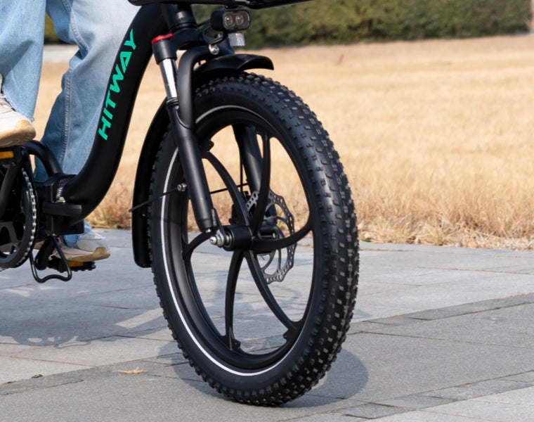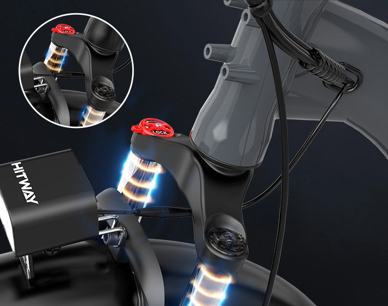 Das HITWAY E-Bike ist mit einer Federgabel mit Lockout-Funktion ausgestattet, die es Ihnen ermöglicht, zwischen komfortabler Dämpfung auf unebenem Gelände und einer starren Gabel für effizientes Fahren auf ebenen Straßen zu wechseln. So genießen Sie jederzeit optimale Kontrolle und Fahrkomfort.