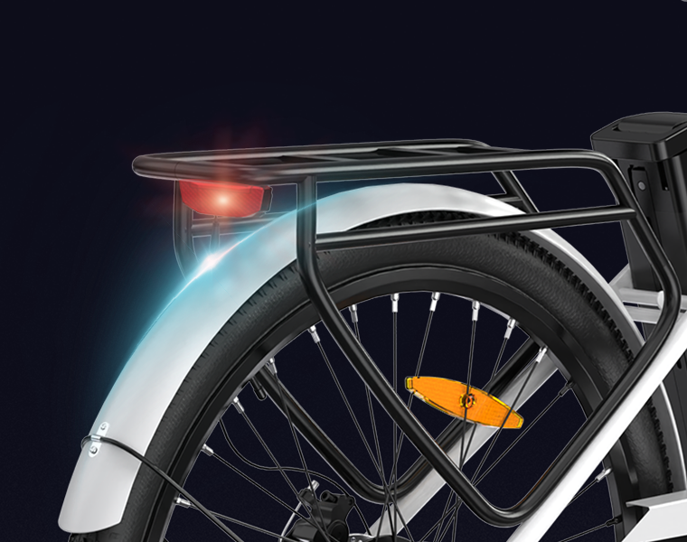 Unser stabiler hinterer Gepäckträger ist darauf ausgelegt, schwere Lasten zu tragen. Er bietet eine praktische Lösung für den Transport von Lebensmitteln, Ausrüstung oder persönlichen Gegenständen. Nutzen Sie die zusätzliche Transportkapazität, um die Vielseitigkeit Ihres E-Bikes zu maximieren.