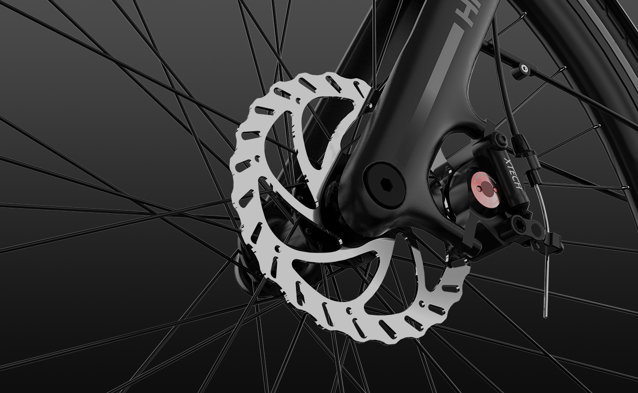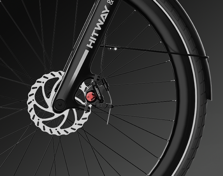 Das HITWAY X ist mit präzise ansprechenden hydraulischen Scheibenbremsen ausgestattet, sowohl vorne als auch hinten. Sie bieten verlässliche Bremskraft bei jedem Wetter – für eine sichere Fahrt, egal ob in der Stadt oder auf längeren Strecken.