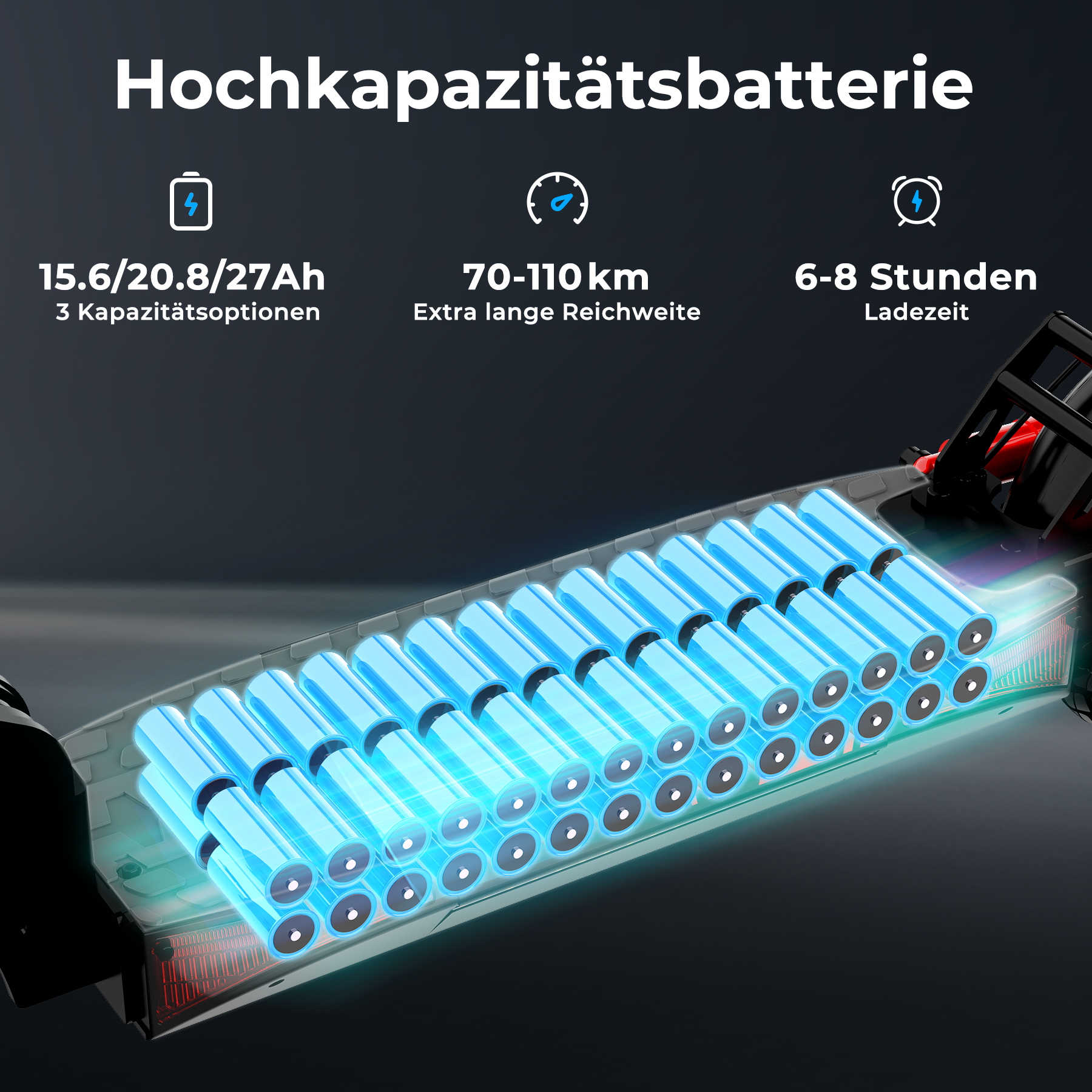 Wählen Sie aus drei Akkuoptionen: 48V 15,6Ah, 20,8Ah und 27Ah. Mit einer Reichweite von bis zu 110 km können Sie sich auf lange Fahrten ohne Sorgen um die Akkulaufzeit freuen