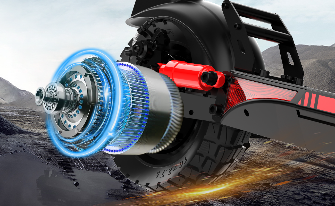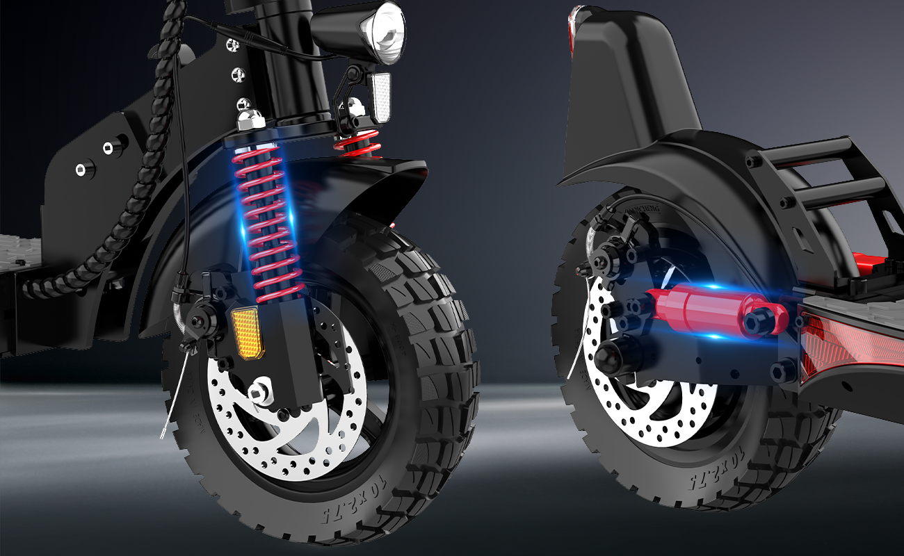 Die 10-Zoll-Schlauchlosreifen bieten eine bessere Vibrationser absorption und reduzieren den Verschleiß durch Reibung zwischen Innen- und Außenreifen, was die Haltbarkeit verlängert. Zusätzlich sorgt das Doppelfeder-Stoßdämpfungssystem vorne und hinten für eine weitere Minderung von Stößen und verbessert so den Fahrkomfort, selbst auf unebenem Terrain.